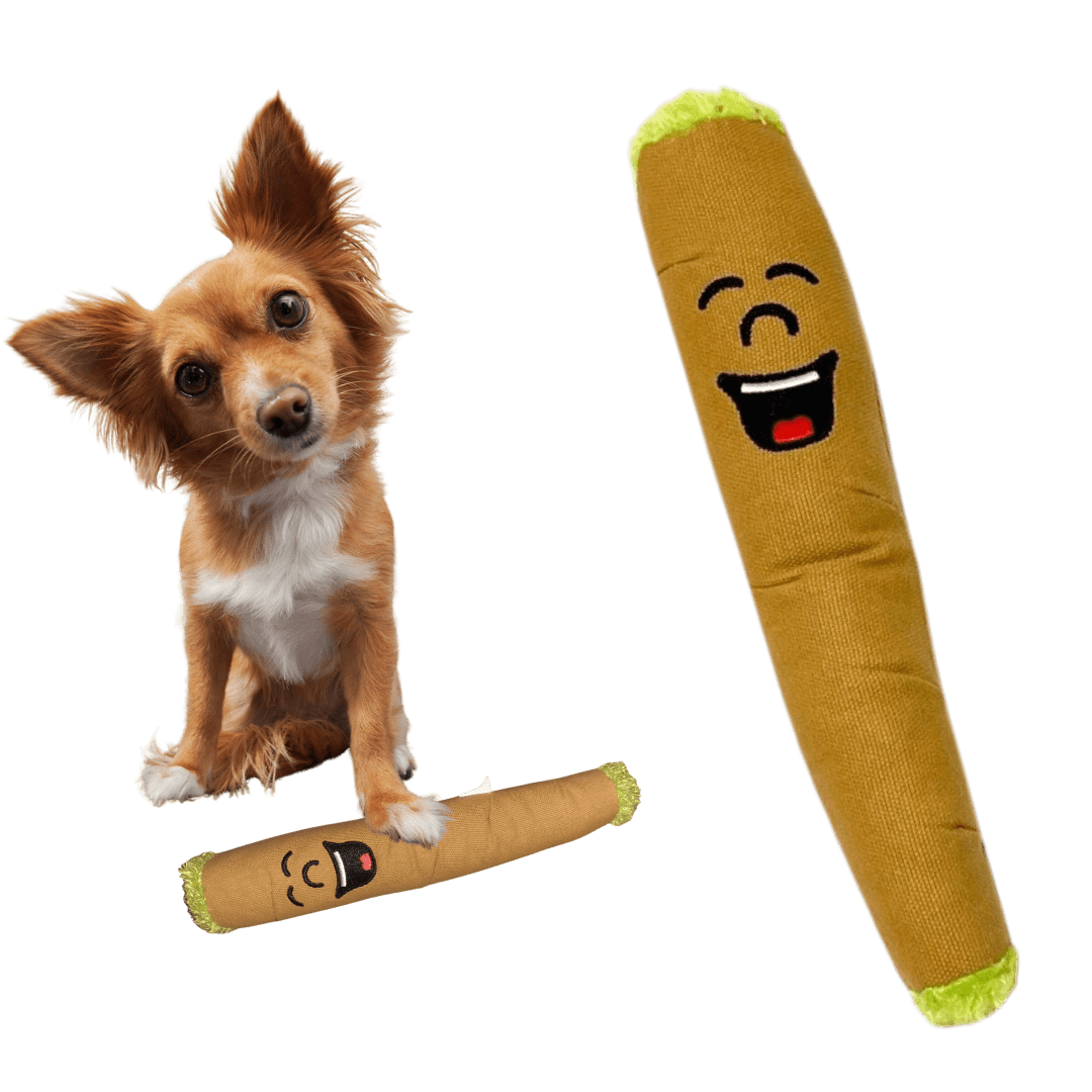 LONG LASTING:Your B the Blunt dog toy will provide long lasting fun with proper care. While B is made of durable canvas, heis not a chew toy. As with any stuffed toy, your pet must always be supervised during play. B is machine washable in a cold water, delicate wash. We suggest using a mesh laundry bag while laundering.